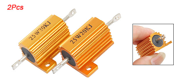 Product Name Aluminum Housed Wirewound Resistor Resistance Value 20K Ohm Power Rating 25W Resistance Tolerance ± 5% (J) Body Size 2.7 x 1.5cm / 1.1" x 0.6" (L*D) Total Size 5.7 x 2.8 x 1.5cm / 2.2" x 1.1" x 0.6" (L*W*H) Casing Material Aluminum Color Gold Tone Weight 29g Package Content 2 x Aluminum Housed Wirewound Resistors - Reviews