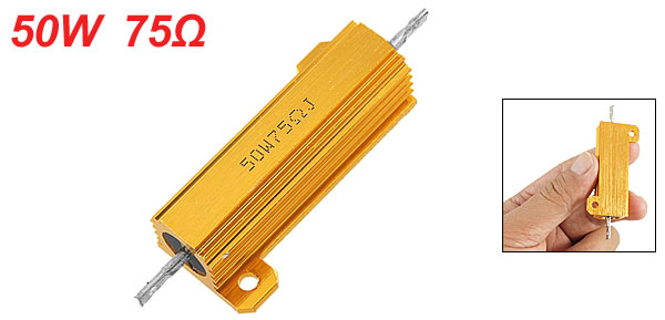 DetailsGold Tone 50W 75 Ohm Aluminum Housed Wirewound Power Resistor  Product Name Aluminium Clad Resistor Power Rating 50W Resistance Value 75 Ohm Resistance Tolerance ± 5% Mounting Hole Dia. 0.3cm / 0.118" Mounting Hole Spacing 4cm / 1.6" Case Size (Exclude Tabs) 5 x 1.6 x 1.5cm / 2" x 0.63" x 0.59" (L*W*H) Overall Size (Approx.) 7.3 x 2.8cm / 2.9" x 1.1" (L*W) Case Material Aluminum Case Color Gold Tone Net Weight 25g Package Content 1 x Aluminium Clad Resistor