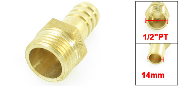 Product Name Male Hose Barb Design Straight Barb End Size 2.5 x 1.5 cm/1" x 0.6"(OD*Inner Dia.) Male Thread Dia. 14mm / 1/2" Hose Diameter 14mm/0.6" Overall Size 4 x 2.5 cm/1.6" x 1" (L*Max.D) Material Brass Color Gold Tone Net Weight 36g Package Content 1 x Male Hose Barb - Reviews