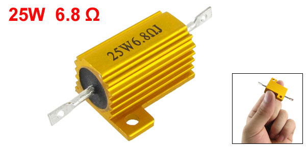 Product Name Aluminum Housed Resistor Resistance Value 6.8Ω Power Rating 25W Resistance Tolerance ± 5% (J) Body Size 27 x 15mm / 1.1" x 0.59" (L*D) Mounted Hole Dia. (Each) 3mm / 0.12" Total Size 53 x 27 x 15mm / 2.1" x 1.1" x 0.59" (L*W*T) Casing Material Aluminum Color Gold Tone Weight 14g Package Content 1 x Aluminum Housed Resistor - Reviews