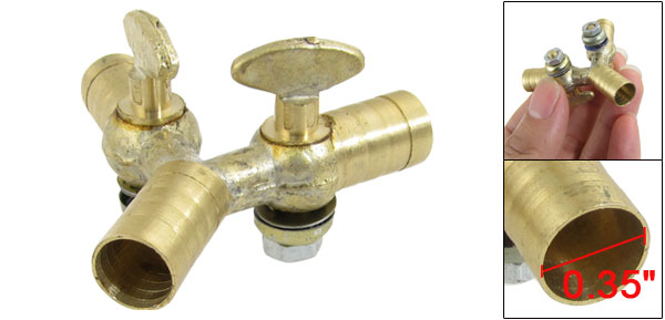 DetailsGold Tone Three Way Double Outlet Y Design Gas Control Valve  Product Name Gas Valve Type Y Type Hose Tail OD(Each One) 9mm/ 0.35" Overall Size 50 x 45 x 30mm/ 1.9" x 1.8" x 1.2" (L*W*H) Color Gold Tone Material Brass, Plastic Weight 28g Package 1 x Gas Valve