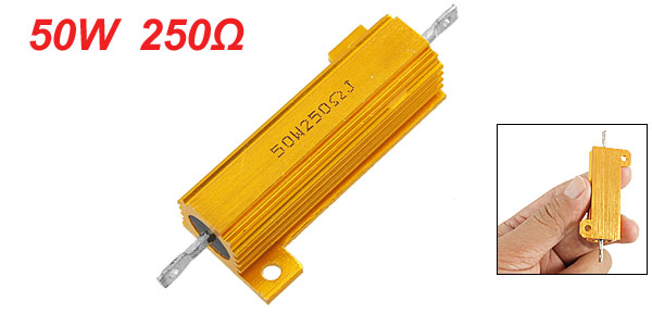 Product Name Aluminium Clad Resistor Power Rating 50W Resistance Value 250 Ohm Resistance Tolerance ± 5% Mounting Hole Dia. 0.3cm / 0.118" Mounting Hole Spacing 4cm / 1.6" Case Size (Exclude Tabs) 5 x 1.6 x 1.5cm / 2" x 0.63" x 0.59" (L*W*H) Overall Size (Approx.) 7.3 x 2.8cm / 2.9" x 1.1" (L*W) Case Material Aluminum Case Color Gold Tone Net Weight 26g Package Content 1 x Aluminium Clad Resistor - Reviews