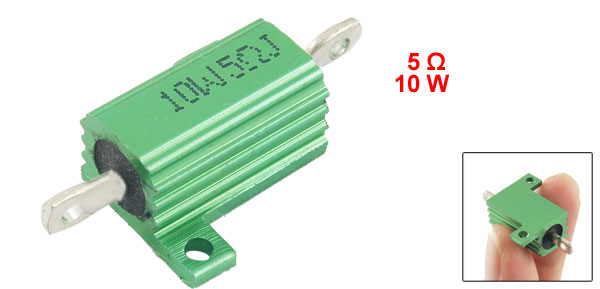 DetailsGreen 10 Watt 5 Ohm 5% Aluminum Shell Wire Wound Resistor  Product Name Aluminum Housed Resistor Resistance Value 5 Ω Power Rating 10W Resistance Tolerance ± 5% (J) Body Size 18 x 11mm/ 0.71" x 0.43" (L*D) Mounted Hole Size 1.8mm/ 0.07", 2mm/ 0.08" Total Size 32 x 16 x 11mm/ 1.2" x 0.63" x 0.43" (L*W*T) Casing Material Aluminum Color Green Weight 5g Package Content 1 x Aluminum Housed Resistor