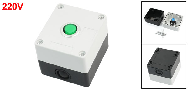 Product Name Control Station Hole Diameter 22mm/ 0.87" Lamp Voltage 220V Lamp Color Green Box Size 78 x 71 x 65mm/3" x 2.8" x 2.5" (L*W*H) Button Dia 16mm/0.6" Mounting Hole Diameter 5mm/ 0.2" Mounting Hole Center Distance 64 x 58mm/2.5" x 1.5"(L*W) External Material Plastic External Color Black, White, Green Net Weight 125g Package Content 1 x Control Station