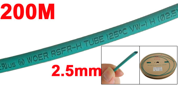 DetailsGreen 2.5mm x 200 Meters Heat Shrinkable Tubing Tube Roll  Product Name Heat Shrinkable Tube Material Polyolefin Rated Voltage 600V Temperature Level 125°C Flammability VW-1 Diameter 2.5mm / 0.098" (Before Shrinking) 1.3mm / 0.051"(After Shrinking) Shrink Ratio 2:1 Length (Approx.) 200m / 7874" Package Roll Size 45 x 3.1cm / 17.7" x 1.2"(D * H) Color Green Weight 725g Package Content 1 x Heat Shrinkable Tube