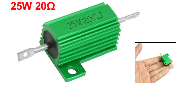 Product Name Aluminum Resistor Resistance Value 20 Ω Power Rating 25W Resistance Tolerance ± 5% (J) Body Size 26 x 15mm/1" x 0.6" (L*D) Mounted Hole Size 1.5mm/0.06", 2.5mm/0.1" Total Size 53 x 27 x 15mm/2.1" x 1.1" x 0.6" (L*W*T) Casing Material Aluminum Color Green Weight 13g Package Content 1 x Aluminum Resistor - Reviews