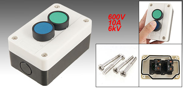 Product Name Push Button Station Action Type Momentary Contact Type NO Ui 600V Ith 10A Uimp 6kV Material Plastic, Metal Button Diameter 2.5cm/ 1" Overall Size(not include the button) 10.5 x 6.8 x 5cm/ 4.11" x 2.7" x 2" (L*W*H) Overall Height 6cm / 3.6" Button Color Green, Blue Net Weight 160g Package Content 1 x Push Button Station - Reviews