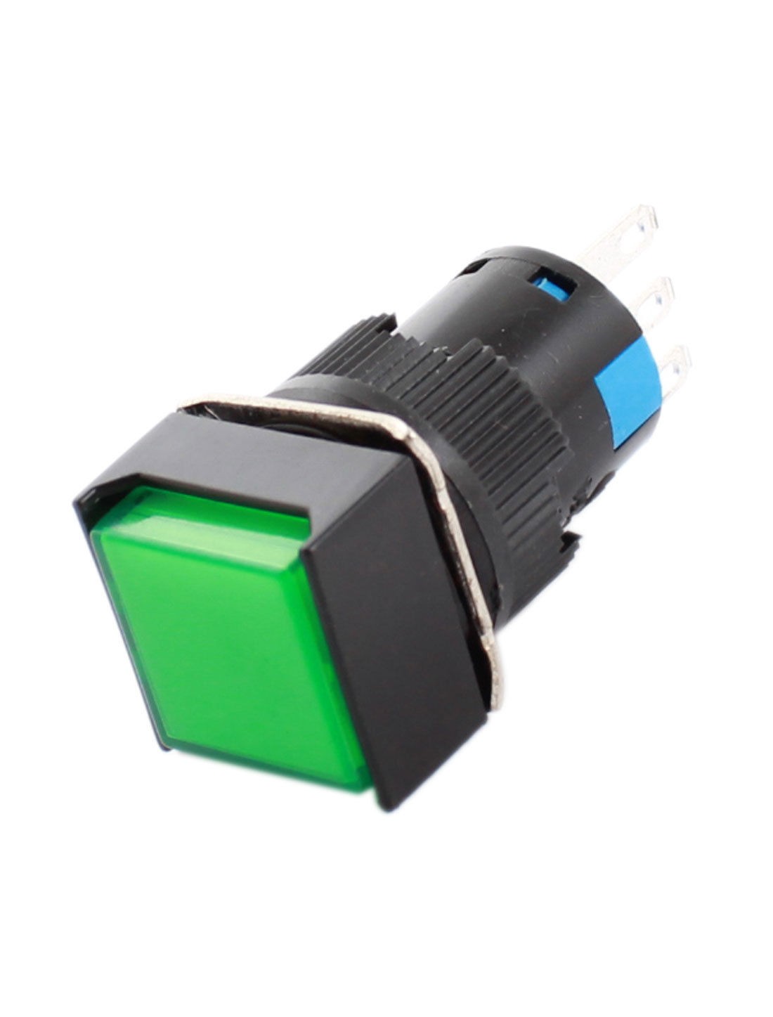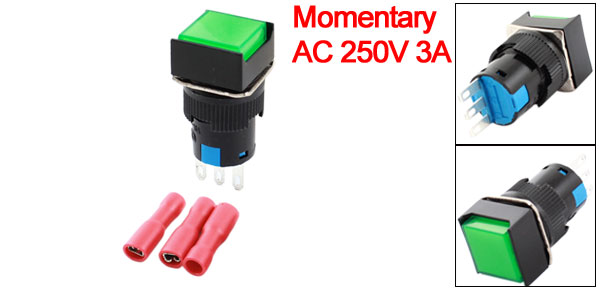 DC 30V 5AThread Dia 16mm/0.63" Total Size(Not Included Pin) 18 x 18 x 31mm /0.71" x 0.71" x 1.2" (L*W *H) External Color Blue, Black, Green Material Plastic, Metal Net Weight 9g Package Content 1 x Rectangle Head Push Button Switch w Crimp Connector