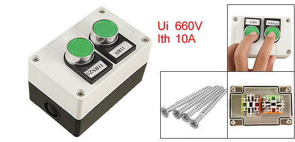 Product Name Push Button Station Action Type Self-locking Contact Type 1NO 1NC Ui 660V Ith 10A Material Plastic, Metal Button Diameter(Approx.) 2.5cm/ 1" Overall Size(not include the button) 10.8 x 7.1 x 6.3cm/ 4.3" x 2.8" x 2.5" (L*W*H)