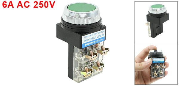 Product Name Push Button Switch Contact Type 1NO, 1NC Working Voltage & Electricity AC 250V, 6A Max Voltage 600V Terminal Quantity 4 Panel Cutout Diameter 29mm / 1.14" Fit Panel Max. Thickness 6mm / 0.24" Total Size(Approx) 6.5 x 3.5 x 3.5cm / 2.56" x 1.4" x 1.4" (L*W*H) External Material Plastic, Electric Parts Color Black, Green Net Weight 46g Package Content 1 x Push Button Switch - Reviews