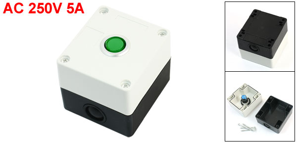 Product Name Push Button Station Hole Diameter 22mm/ 0.87" Push Button Rating AC 250V 5A Contact Type SPDT( 1 NO 1 NC) Box Size 78 x 71 x 65mm/3" x 2.8" x 2.5" (L*W*H) Button Dia 16mm/0.6" Mounting Hole Diameter 5mm/ 0.2" Mounting Hole Center Distance 64 x 58mm/2.5" x 1.5"(L*W) External Material Plastic External Color Black, White, Green Net Weight 125g Package Content 1 x Push Button Station