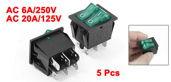 Terminals 6 Pins Position On-Off Lamp Color Green Rated Voltage AC 6A/250V, AC 20A/125V Overall Size 23 x 20 x 27mm / 0.9" x 0.8" x 1.1" (L*W*H) Mounting Size 21 x 18mm / 0.83" x 0.71" (L*W) Color Black, Green Material Plastic, Metal Total Weight 71g Package Content 5 x Rocker Switch - Reviews