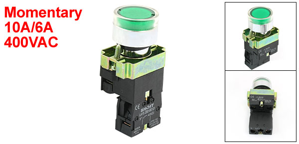 Product Name Push Button Switch Contact Type 1NO SPST Action Type Momentary Rating 10A/6A 400VAC Light Color Green Lamp Voltage 400V Max. Terminal Quantity 4 Panel Cutout Diameter 22mm / 0.9" Fit Panel Max. Thickness 6.5mm / 0.26" Button Diameter 2.4cm / 0.9" Total Size(Approx) 7.5 x 4 x 3cm/3" x 1.6" x 1.2"(L*W*H) External Material Plastic, Metal, Electric Parts Main Color Green, Black Net Weight 77g Package Content 1 x Push Button Switch - Reviews