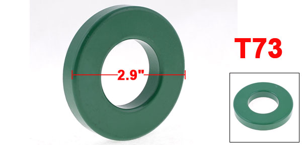 Product Name Ferrite Core Model T73 Material Iron Color Green Overall Size 74 x 38 x 13mm/ 2.9" x 1.5" x 0.51"(Outside Dia.*Inner Dia.*T) Weight 196g Package Content 1 x Toroid Ferrite Core - Reviews