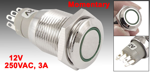 Main Color Silver Tone Brand Assisi Terminal Number 5 Country of Manufacture CHINA Lamp Type LED Material Stainless Steel Contact Type Com+NO+NC Total Size 38 x 22mm/1.5'' x 0.9''(L*Max.W) Product Name Push Button Switch Net Weight 15g Mounting Size 16mm Package Content 1 x Push Button Switch Pole and Throw SPDT Light Voltage DC12V Operation Pressure 2.5-4N SizeName-ColorName 16mm Mounting Type Flush Mount LED Lamp Color Green Switch Housing Material Stainless Steel Switch Rating AC 250V 3A Oeperation Type Momentary UPC 610256309279 Head Shape Flat Head - Reviews
