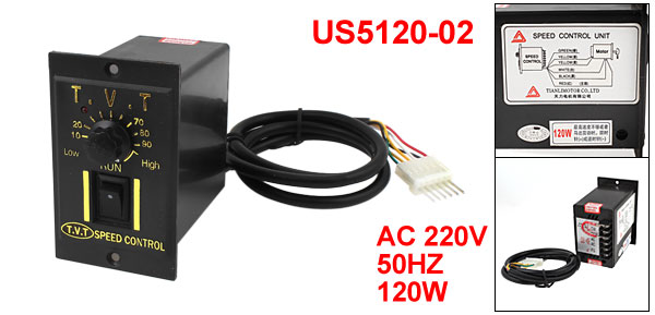 Product Name Motor Speed Controller Model US5120-02 Material Plastic, Electronic Part Connector 6 Pins Rated Value AC 220V, 50HZ Power 120W Size 110 x 59 x 98mm/ 4.3" x 2.3" x .9" (L*W*H) Cable Length 60cm/ 23.6'' Color Black Weight 220g Package Content 1 x Motor Speed Controller - Reviews