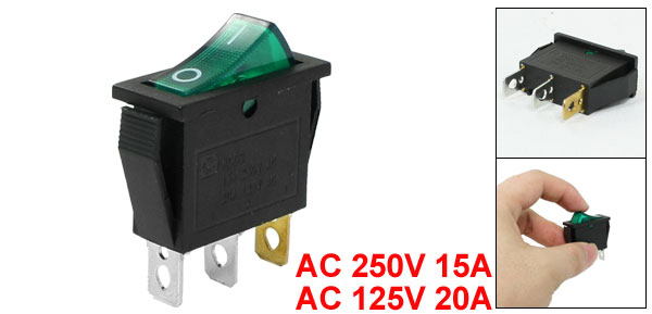 DetailsGreen Light Illuminated 3 Pins SPST ON/OFF Snap in Boat Rocker Switch  Product Name Rocker Switch Poles SPST(On-Off) Terminals 3 Pin Rating Voltage AC 250V 15A