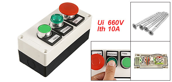 Product Name Push Button Station Ui 660V Ith 10A IEC 337 Lamp Voltage 220V Material Plastic, Metal Overall Size(not include the button) 14.7 x 7 x 6.3cm/15.8'' x 2.7'' x 2.5'' (L*W*H) Overall Height 9cm / 3.5" Color As Picture Shown Net Weight 293g Package Content 1 x Push Button Station - Reviews
