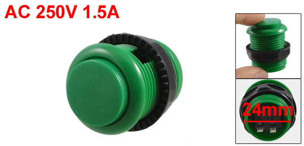 Product Name Arcade Game Push Button Action Type Momentary Rated Voltage & Current AC 250V 1.5A Pin Number 2 Mounting Hole Diameter 24mm / 0.94" Soldering Distance(center to center) 5mm / 0.2" Button Head Diameter 19mm / 0.75" Total Size 30 x 34mm / 1.18'' x 1.3''(Max.D*H) External Material Plastic Color Green Net Weight 9g Package Content 1 x Arcade Game Push Button - Reviews