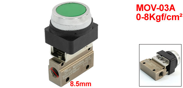 Product Name Mechanical Valve Model MOV-03A Action Type Momentary Button Type Flat Round Button Working Medium Clear Air (40µm filteration) Way Type 3 Position Type 2 Female Thread Diameter 8.5mm/1/8PT Fix Hole Diameter 5.5mm/ 0.22" Operating Temperature Range 0~ 70°C Working Pressure Range 0-8Kgf/cm² Button Diameter 25mm/ 1" Body Size 43 x 15 x 35mm/ 1.7" x 0.6" x 1.4"(L*W*H) Total Size(Approx) 65 x 43 x 32mm / 2.6" x 1.7" x 1.3" (L*W*H) Fixed Hole Dia 4.3mm/0.17" Material Alloy, Plastic Main Color Gray, Black, Green Net Weight 76g Package Content 1 x Mechanical Valve - Reviews