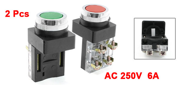 Product Name Push Button Switch Action Type Momentary Contact Type 1 NO + 1 NC Rated Voltage AC 250V, 600V Max. Rated Current 6A Terminals Quantity 4 Screw Terminals Panel Cutout Diameter 30mm / 1.2" Fit Panel Thickness Max 5mm / 0.2" Button Diameter 20mm / 0.8" Overall Size 32 x 36 x 64mm/ 1.26" x 1.42" x 3"(L*W*H) Material Plastic, Metal Color Green, Red, Black Weight 100g Package Content 2 x Push Button Switch - Reviews