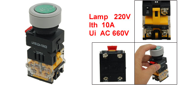 Product Name Push Button Switch Model No. LA160-22A-11DNZS Contact Type 1 NO(Normally Open) + 1 NC(Normally Close) Action Type Locking Type Ith 10A Ui AC 660V Lamp Rated Voltage 220V Panel Cutout Diameter 2.2cm / 0.87"(7/8") Fit Panel Thickness(Adjustable) Max 0.5cm / 0.2" Button Diameter 2.4cm / 0.94" Total Size 3.6 x 2.9 x 8.5cm / 1.4'' x 1.1'' x 3.3'' (L*W*H) Main Material Plastic, Metal Main Color Push Button: Green Body: Black, Yellow, Red, Gray Weight 71g Package Content 1 x Push Button Switch - Reviews