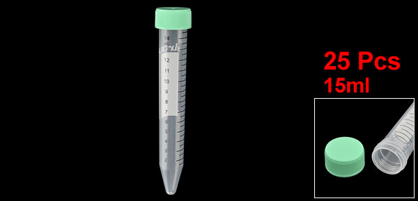Product Name Centrifuge Tube Material Plastic Capacity 15ml/0.5oz Overall Size (Approx.) 20 x 120mm/ 0.8" x 4.7" (D*L) Color Clear,Green Net Weight 178g Package Content 25 (±2%) x Centrifuge Tube