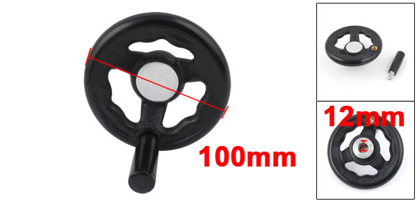 Product Name Handwheel Spoke 3 Wheel Diameter 100mm /4" Pilot Bore Diameter 12mm/0.47" Wheel Total Height(Not Included Handle) 44mm/1.73" Handle Size(Not Included Screw) 17 x 50mm/0.67" x 2"(D*L) Handle Thread Size M8 x 15mm/0.3" x 0.6"(D*L) Side Hole Dia M5/0.2" Thickness (Approx.) 14mm / 0.5" Materials Bakelite, Metal Net Weight 170g Package Content 1 x Handwheel