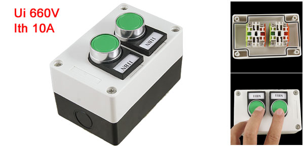 Product Name Push Button Station Action Type(Each Swtich) Momentary Contact Type(Each Swtich) 1NO 1NC Ui 660V Ith 10A Material Plastic, Metal Button Diameter(Approx.) 2.5cm/ 1" Overall Size(not include the button) 10.8 x 7.1 x 6.3cm/ 4.3" x 2.8" x 2.5" (L*W*H)