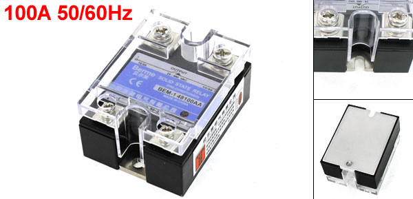 Product Name Solid State Relay Model No. BEM-148100AA Material Metal, Plastic, Electronic Parts Current & Frequency 100A, 50/60Hz Output Voltage 24-480VAC Control Voltage 80-250VAC Mounting Hole Diameter 4.5mm / 0.18" Total Size (Approx.) 58 x 45 x 32mm / 2.3" x 1.8" x 1.26" (L*W*T) Net Weight 116g Package Content 1 x Solid State Relay - Reviews