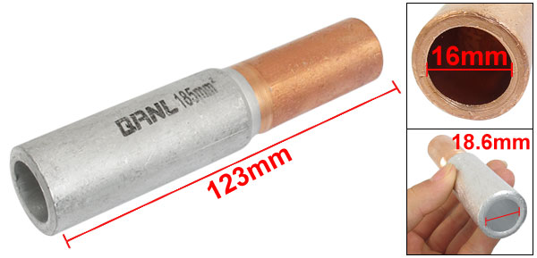 Product Name Hole-passing connecting tube Model GTL-185 Cross-Sectional Area 185mm2 Inner Diameter(Copper Tone) 16mm / 0.63" Inner Diameter(Silver Tone) 18.6mm / 0.73" Total Size(Approx) 123 x 27mm / 4.86" x 1.1" (L*D Max) Main Color Silver Tone, Copper Tone Material Aluminum, Copper Weight 171g Package Content 1 x Hole Passing Connecting Tube - Reviews