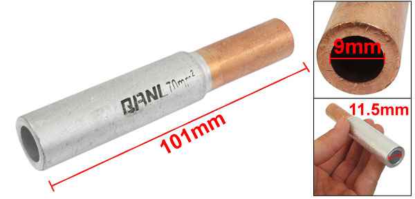 Product Name Hole-passing connecting tube Model GTL-70 Cross-Sectional Area 70mm2 Inner Diameter(Copper Tone) 9mm / 0.36" Inner Diameter(Silve Tone) 11.5mm / 0.45" Total Size(Approx) 101 x 18mm / 3.99" x 0.7" (L*D Max) Main Color Silver Tone, Copper Tone Material Aluminum, Copper Weight 65g Package Content 1 x Hole Passing Connecting Tube - Reviews