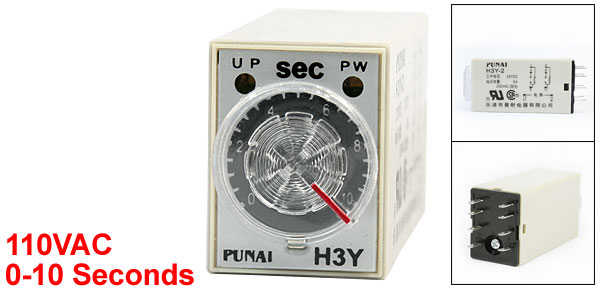 Product Name Timer Delay Relay Model Number H3Y-2 Pin Number 8 Pin Working Voltage 110VAC Contact Type 5A 250VAC Resistive Load Contact Type DPDT Time Range 0-10 Seconds