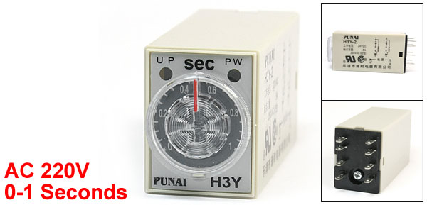 Product Name Timer Delay Relay Model Number H3Y-2 Pin Number 8 Pin Rating AC 220V Contact Type 5A 250VAC Resistive Load Contact Type DPDT Time Range 0-1 Seconds Indicator Operation Two Indicator Lamps Overall Size(Approx) 6.3 x 2.8 x 2.1cm/2.5" x 1.1" x 0.8"(L*W*H) External Material Plastic & Metal Net Weight 40g Package Content 1 x Timer Delay Relay