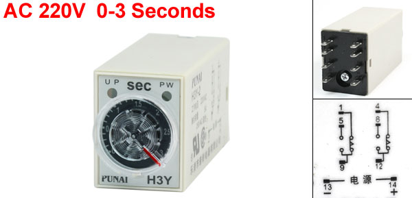 Product Name Timer Delay Relay Model Number H3Y-2 Pin Number 8 Pin Rating AC 220V Contact Type 5A 250VAC Resistive Load Contact Type DPDT Time Range 0-3 Seconds Indicator Operation Two Indicator Lamps Overall Size(Approx) 6.3 x 2.8 x 2.1cm/2.5" x 1.1" x 0.8"(L*W*H) External Material Plastic & Metal Net Weight 40g Package Content 1 x Timer Delay Relay