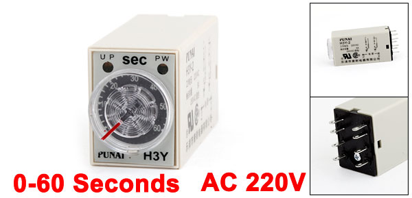Product Name Timer Delay Relay Model Number H3Y-2 Pin Number 8 Pin Rating AC 220V Contact Type 5A 250VAC Resistive Load Contact Type DPDT Time Range 0-60 Seconds Indicator Operation Two Indicator Lamps Overall Size(Approx) 6.3 x 2.8 x 2.1cm/2.5" x 1.1" x 0.8"(L*W*H) External Material Plastic & Metal Net Weight 40g Package Content 1 x Timer Delay Relay