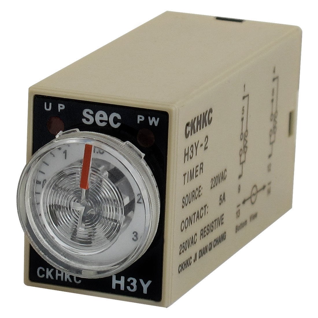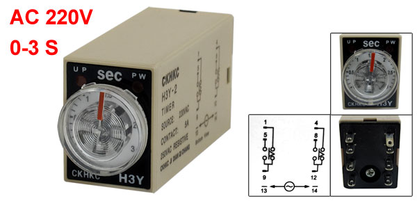 Product Name Time Relay Type H3Y-2 Contact Type DPDT Source AC 220V Contact 5A 250VAC Resistive Load Time Range 0-3 Seconds Number of Terminals 8 Pins Body Size (Approx.) 53 x 27 x 20mm/ 2.1" x 1.1" x 0.8"(L*W*H) Color Gray, Black Net Weight 39g Package Content 1 x Time Relay
