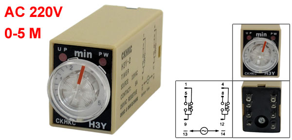 Product Name Time Relay Type H3Y-2 Contact Type DPDT Source AC 220V Contact 5A 250VAC Resistive Load Time Range 0-5 Minutes Number of Terminals 8 Pins Body Size (Approx.) 53 x 27 x 20mm/ 2.1" x 1.1" x 0.8"(L*W*H) Color Gray, Black Net Weight 42g Package Content 1 x Time Relay