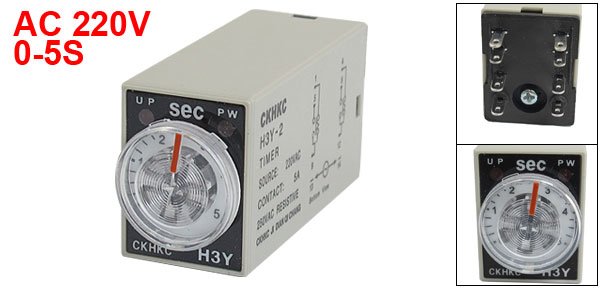 Product Name Time Relay Type H3Y-2 Contact Type DPDT Source AC 220V Contact 5A 250VAC Resistive Load Time Range 0-5 Seconds Number of Terminals 8 Pins Body Size (Approx.) 53 x 27 x 20mm/ 2.1" x 1.1" x 0.8"(L*W*H) Color Gray, Black Net Weight 38g Package Content 1 x Time Relay