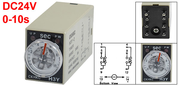 Product Name Time Relay Type H3Y-2 Contact Type DPDT Source DC 24V Contact 5A 250VAC Resistive Load Time Range 0-10 Seconds Number of Terminals 8 Pins Body Size (Approx.) 53 x 27 x 20mm/ 2.1" x 1.1" x 0.8"(L*W*H) Color Gray, Black Net Weight 39g Package Content 1 x Time Relay