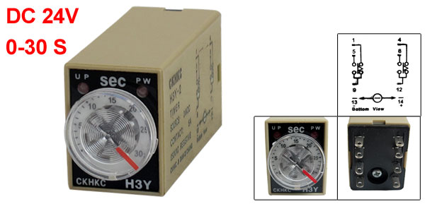 Product Name Time Relay Type H3Y-2 Contact Type DPDT Source DC 24V Contact 5A 250VAC Resistive Load Time Range 0-30 Seconds Number of Terminals 8 Pins Body Size (Approx.) 53 x 27 x 20mm/ 2.1" x 1.1" x 0.8"(L*W*H) Color Gray, Black Net Weight 42g Package Content 1 x Time Relay