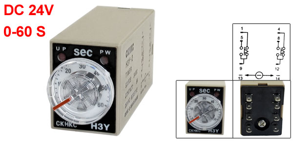Product Name Time Relay Type H3Y-2 Contact Type DPDT Source DC 24V Contact 5A 250VAC Resistive Load Time Range 0-60 Seconds Number of Terminals 8 Pins Body Size (Approx.) 53 x 27 x 20mm/ 2.1" x 1.1" x 0.8"(L*W*H) Color Gray, Black Net Weight 38g Package Content 1 x Time Relay