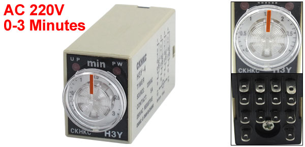 Product Name Time Relay Type H3Y-4 Contact Type 4PDT Source AC 220V Contact 5A 250VAC Resistive Load Time Range 0-3 Minutes Number of Terminals 14 Pins Body Size (Approx.) 53 x 27 x 21mm/ 2.1" x 1.1" x 0.8"(L*W*H) Color Gray, Black Net Weight 40g Package Content 1 x Time Relay