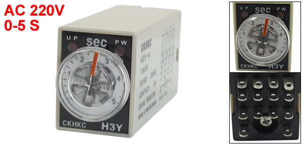 Product Name Time Relay Type H3Y-4 Contact Type 4PDT Source AC 220V Contact 5A 250VAC Resistive Load Time Range 0-5 Seconds Number of Terminals 14 Pins Body Size (Approx.) 53 x 27 x 21mm/ 2.1" x 1.1" x 0.8"(L*W*H) Color Gray, Black Net Weight 41g Package Content 1 x Time Relay
