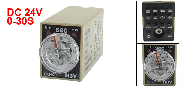 Product Name Time Relay Type H3Y-4 Contact Type 4PDT Source DC 24V Contact 5A 250VAC Resistive Load Time Range 0-30 Seconds Number of Terminals 14 Pins Body Size (Approx.) 53 x 27 x 21mm/ 2.1" x 1.1" x 0.8"(L*W*H) Color Gray, Black Net Weight 40g Package Content 1 x Time Relay