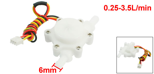 Product Name Water Flow Sensor Model SEN-HZ06C Type Straight Type Flow Range 0.25-3.5L/min Working Voltage & Current DC3V-18V, 10mA Rated Voltage DC5V Pulse Duty Factor 50 % High Level of Pulse Output >4.5V Low Level of Pulse Output <0.5V Max Pressure 0.8Mpa Insulation Performance(Min.) 100MΩ Connector Type 3Pin JST Connector Main Material POM Total Size 65 x 40 x 23mm / 2.6" x 1.6" x 0.91"(L*W*T) Outlet=Inlet Outer Diameter 6mm/0.24" Cable Length 32cm / 12.6" Body Color White Weight 27g Package Content 1 x Water Flow Sensor - Reviews
