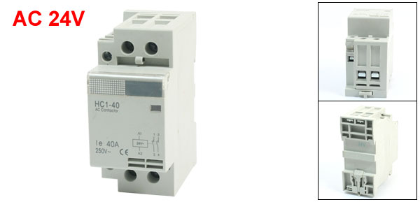 Product Name AC Contactor Model No. HC1-40 Rated Coil Voltage AC 24V Rated Current 40A Rated Voltage(Ue) AC 250V Number of Poles 2 Terminal Number 6 Mounting Type 35mm DIN Rail Mount Overall Size(Approx.) 82 x 37 x 68mm / 3.2" x 1.5" x 2.7"(L*W*T) Material Plastic, Electronic Parts Color Gray Net Weight 220g Package Content 1 x AC Contactor - Reviews