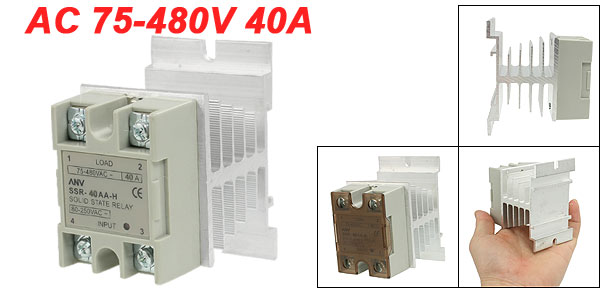 Product Name Solid State Relay w Heat Sink Type SSR-40AA-H Material Relay: Metal, Plastic, Electric Parts Heat Sink: Aluminum Rated Load Current 40A Input AC 80-250V Output AC 75-480V Relay Size 5.7 x 4.4 x 2.5cm / 2.2" x 1.7" x 1" (L*W*T) Heat Sink Size 8.1 x 4.9 x 5cm/ 3.1" x 1.9" x 2"(L*W*H) Total Size 8.1 x 5 x 7.6cm/ 3.1" x 2" x 3"(L*W*H) Main Color Silver Tone, Gray Weight 200g Package Content 1 x Solid State Relay