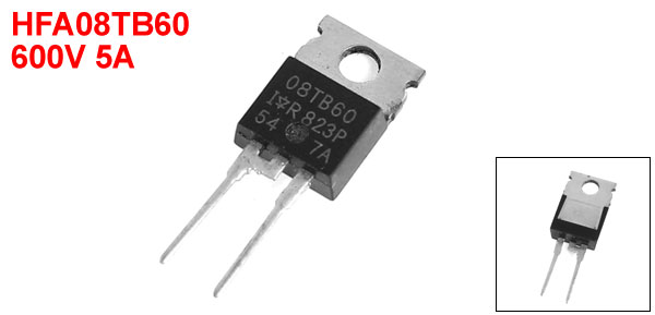 DetailsHFA08TB60 600V 5A 3 Terminals TO-220AC Package NPN Silicon Transistor  Product Name NPN Transistor Model No. HFA08TB60 Mounted Type Through Hole Package TO-220AC VR 600V IRRM 5A Mounting Hole Diameter 3.5mm / 0.14" Pin Length 14mm / 0.79" Total Size 29 x 10 x 4mm /1.1" x 0.39" x 0.16" (L*W*H) Main Material Silicon, Metal Main Color Black, Silver Tone Weight 3g Package 1 x NPN Transistor