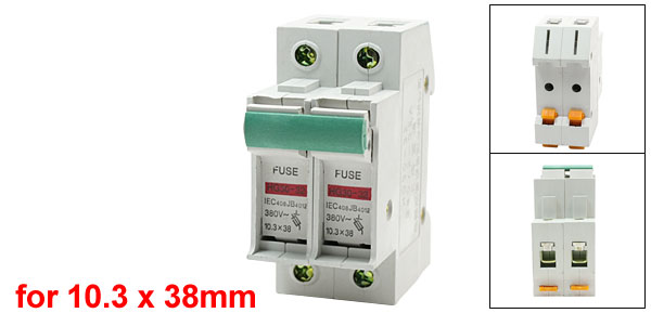 Product Name Fuse Holder Type HG30-32 Fit Fuse Type for 10.3 x 38mm(Not Included Here) Rated Voltage AC 380V Rated Current 32A Poles Quantity 2 Mounting Type 35mm DIN Rail Mount Overall Size(Approx) 8 x 7.3 x 3.5cm/3.15" x 2.9" x 1.4"(L*W*H)